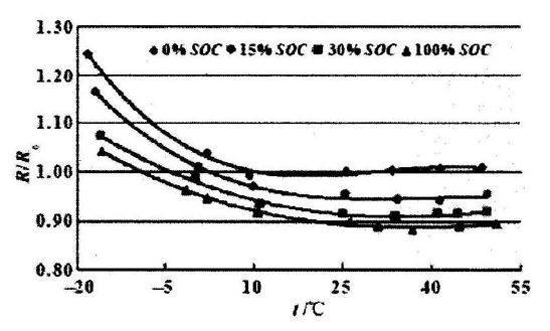 鋰電池溫度與電阻的關系,如下圖所示。不同的曲線代表電池自身不同的荷電量。任何一個荷電量下,電池內(nèi)阻都隨著溫度的降低而明顯升高,荷電量越低的電芯,內(nèi)阻越大,并且這個趨勢也隨著溫度的變化而保持不變。